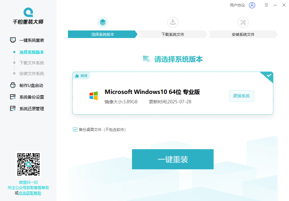 千柏重装大师是一款智能安装操作系统的装机软件。无需光驱,无需优盘,五步流水线流程,即自动检测电脑环境-系统自动备份文件-选择最佳的操作系统-下载操作系统-安装操作系统-等待完成。千柏重装大师操作简单易懂,安装Windows7、Windows8、Windows10、Windows11都支持,绿色重装系统软件无广告。